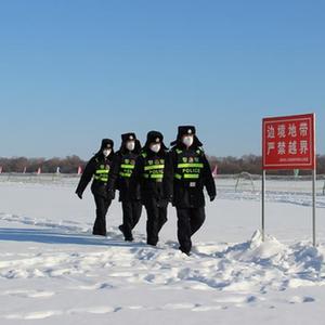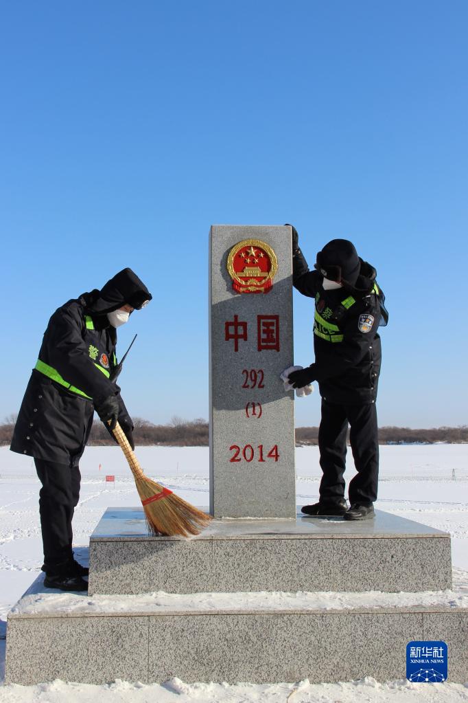 1月22日,雞西邊境管理支隊虎頭邊境派出所的移民管理警察在清掃界碑。