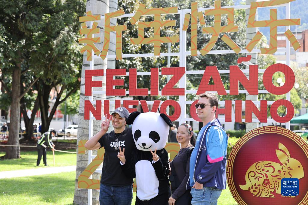1月22日,在哥倫比亞首都波哥大市中心的93公園,人們與新年字標合影留念。