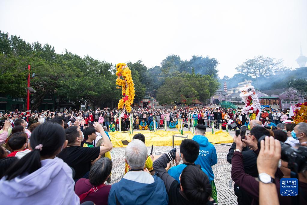 當日是大年初二,澳門(mén)旅游局在媽閣廟前安排了舞龍舞獅、變臉等賀歲活動(dòng),吸引大批市民及游客駐足觀(guān)賞。
