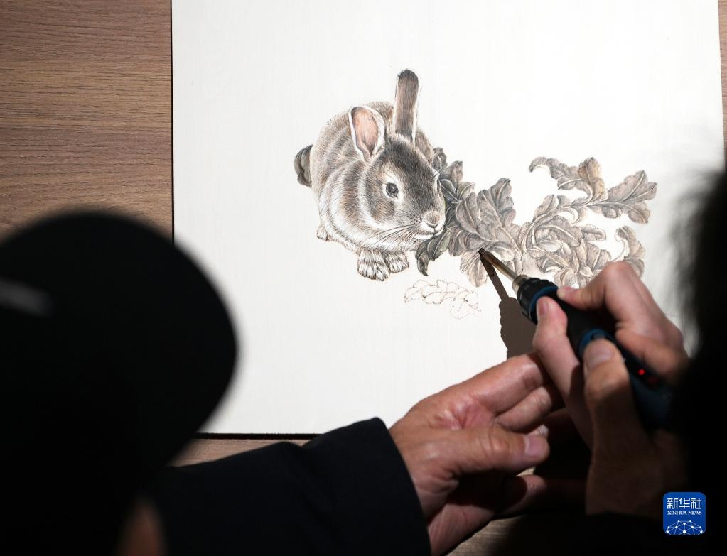 在石家莊市新華區一處文化名家工作室,一名烙畫(huà)藝人教小朋友制作烙畫(huà)作品(1月12日攝)。