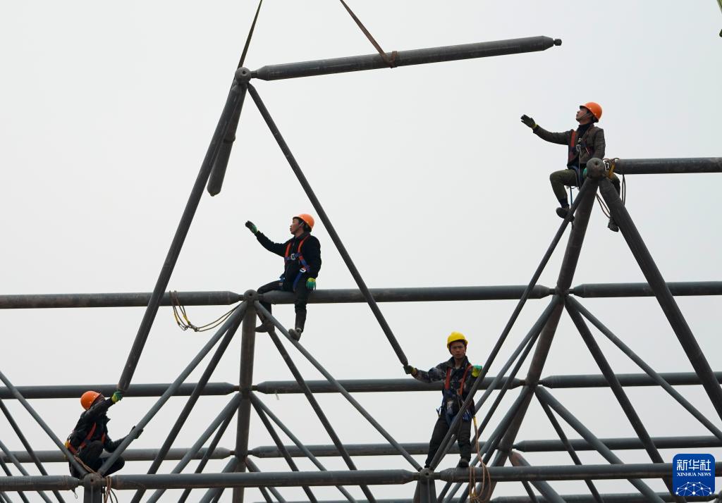 1月23日,在重慶兩江新區新能源汽車(chē)產(chǎn)業(yè)園基礎設施配套項目現場(chǎng),工人在吊車(chē)的協(xié)助下進(jìn)行鋼結構網(wǎng)架拼裝作業(yè)。