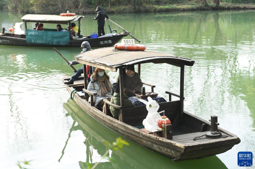 1月24日,裝飾有兔年主題花燈的搖櫓船行駛在西溪濕地的水道上。