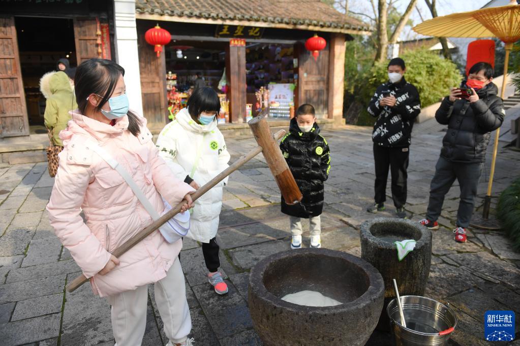 1月24日,游客在西溪濕地體驗年糕制作。