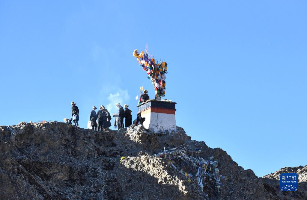 1月23日,西藏拉孜縣曲瑪鄉的藏族群眾在山上豎起五彩經(jīng)幡。