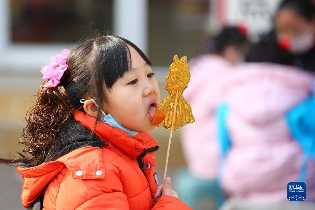 1月22日,一名小女孩在山東省滕州市西崗鎮品嘗糖畫(huà)。