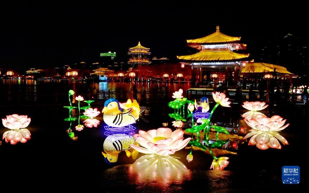 夜幕降臨,西安大唐芙蓉園內萬(wàn)盞花燈璀璨綻放,在仿唐式園林的亭臺樓閣、廊橋水波之間,燈與景交相輝映,美輪美奐。