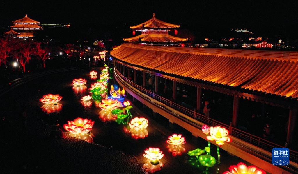 夜幕降臨,西安大唐芙蓉園內萬(wàn)盞花燈璀璨綻放,在仿唐式園林的亭臺樓閣、廊橋水波之間,燈與景交相輝映,美輪美奐。