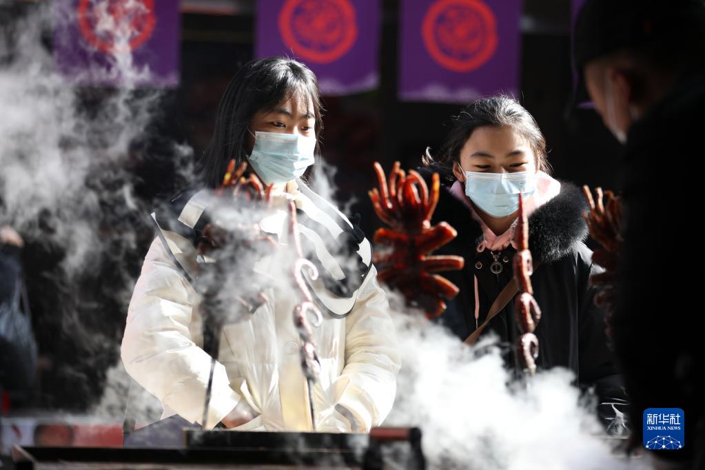 1月25日,游客在山東省臨沂市郯城縣郯國古城景區美食街購買(mǎi)美食。