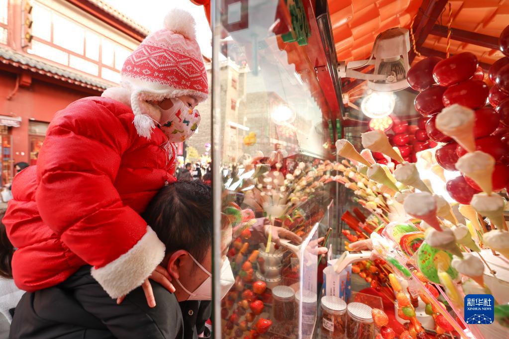 1月24日,家長(cháng)帶著(zhù)小朋友在湖北襄陽(yáng)古城北街選購糖葫蘆。