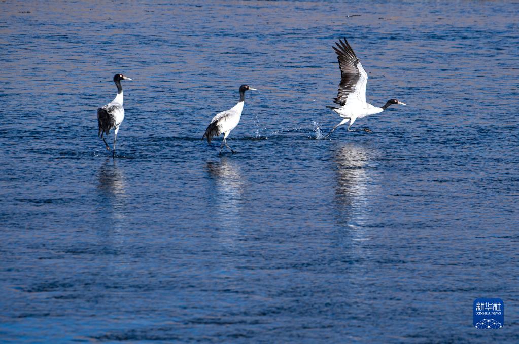 在西藏雅魯藏布江中游河谷黑頸鶴國家級自然保護區日喀則片區拉孜縣附近,大量越冬的黑頸鶴翩翩起舞,迎接春天的到來(lái)。