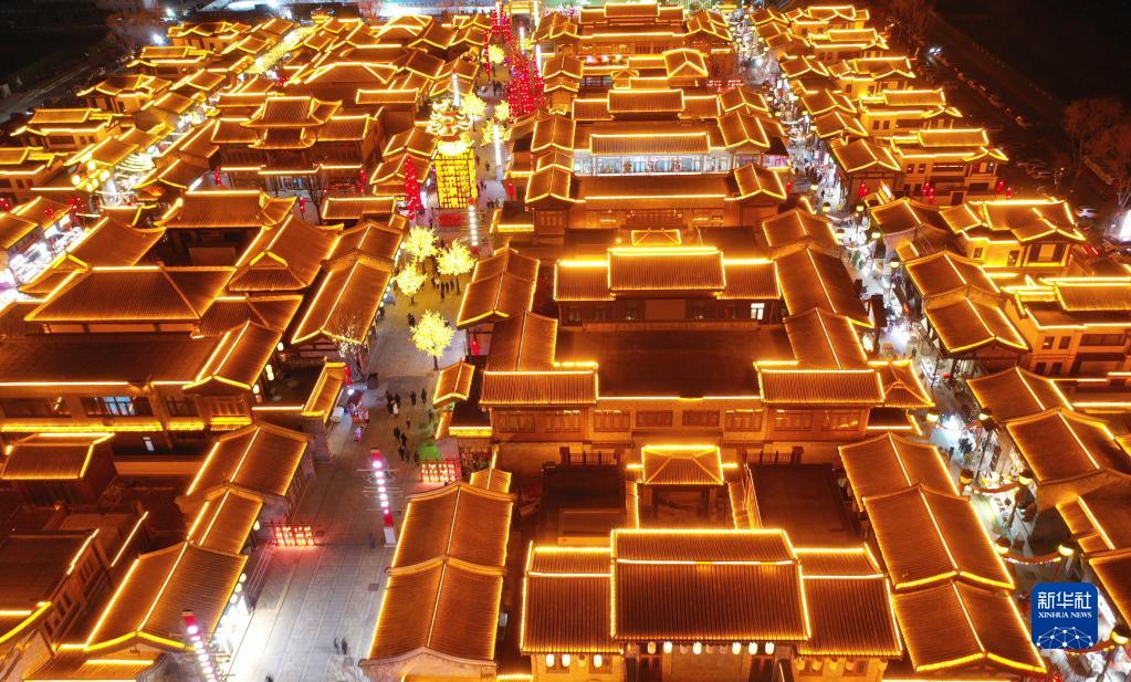 1月25日,游客在山東省臨沂市郯城縣郯國古城景區游玩(無(wú)人機照片)。