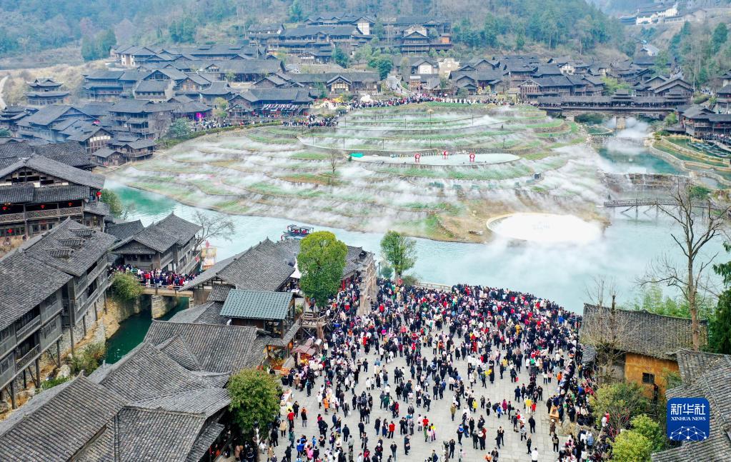 1月25日,游客在貴州省遵義市播州區境內的貴州烏江寨國際旅游度假區核心景區廻龍島欣賞水舞秀節目表演。