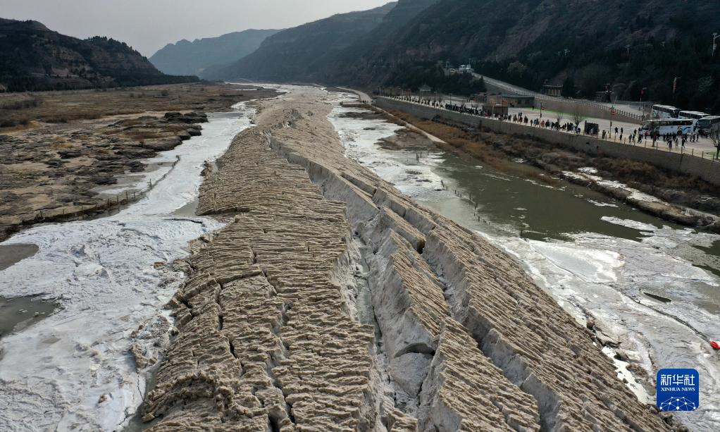 這是1月25日在山西吉縣黃河壺口瀑布拍攝的冰封的十里龍槽(無(wú)人機照片)。
