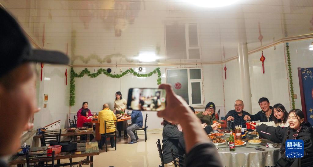 邵鋒在民宿里為家人和雪友合影(1月21日攝)。