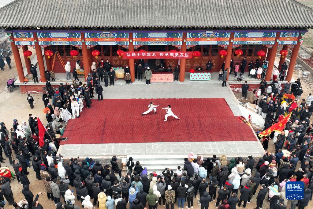 1月26日,梅花拳愛(ài)好者在平鄉縣油召鄉八辛莊村進(jìn)行梅花拳對練(無(wú)人機照片)。