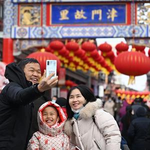 1月26日,游客在天津古文化街游玩時(shí)留影。