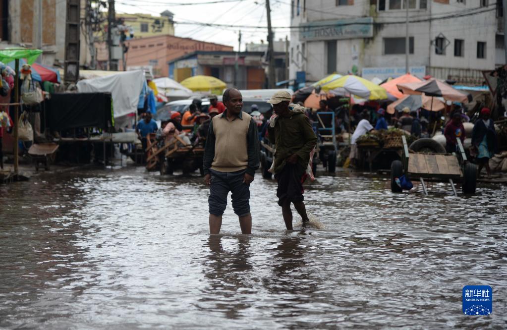 1月25日,在馬達加斯加首都塔那那利佛,行人走過(guò)積水的道路。
