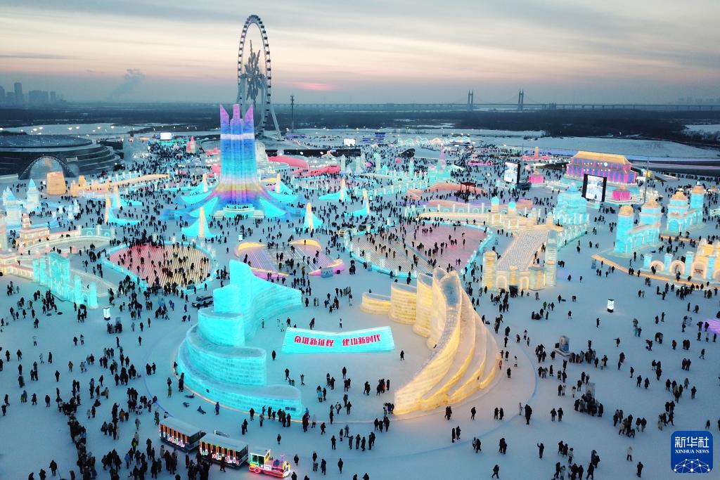1月25日,游客在哈爾濱冰雪大世界園區內游玩(無(wú)人機照片)。