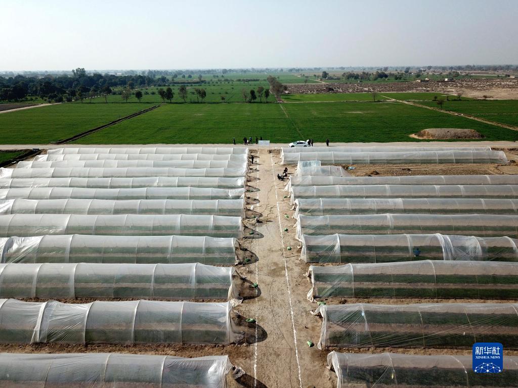 這是1月16日在巴基斯坦旁遮普省木爾坦拍攝的中巴辣椒訂單種植項目辣椒育苗大棚(無(wú)人機照片)。
