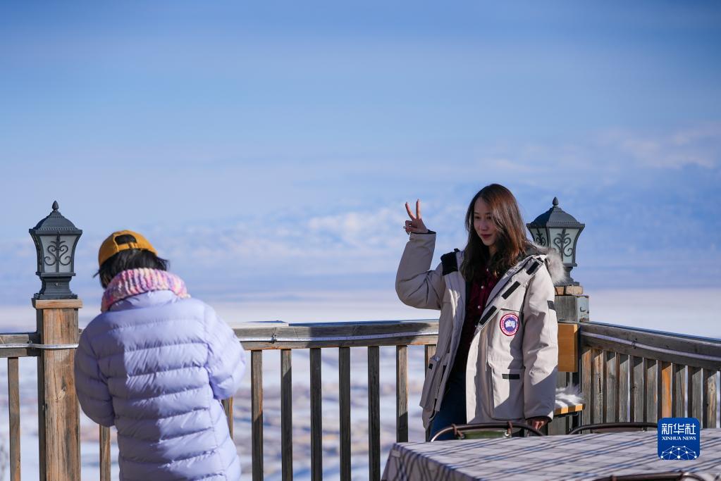 游客在絲綢之路國際滑雪場(chǎng)艾文大道頂上的咖啡屋拍照留念(1月25日攝)。