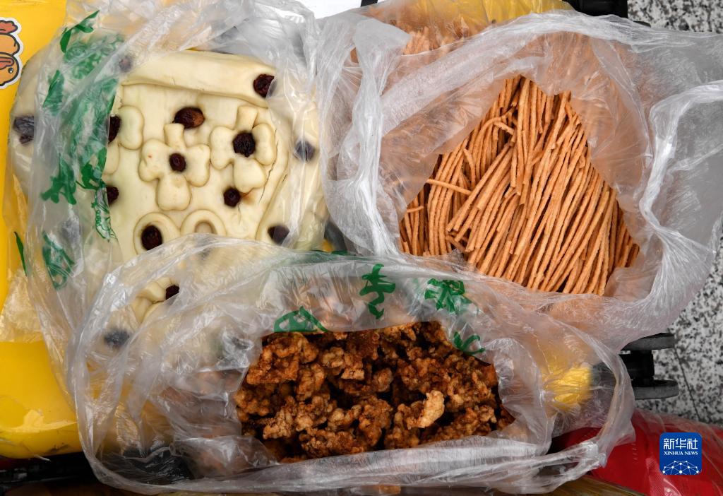 崔偉行囊里裝的母親親手制作的油炸酥肉、棗饃等他和兒子愛(ài)吃的食品(1月26日攝)。