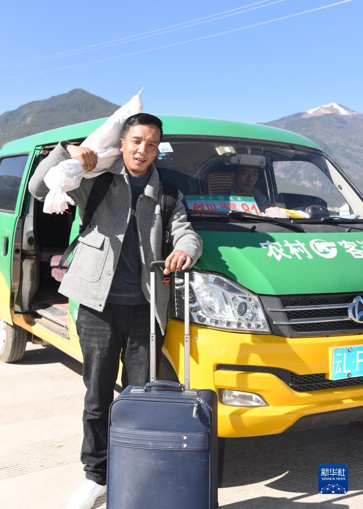 云南省大理白族自治州劍川縣馬登鎮文屏村人張茂盛扛著(zhù)火腿、扶著(zhù)行李箱在農村客運車(chē)前留影,準備前往云南省麗江市創(chuàng )業(yè)(1月26日攝)。這是張茂盛外出務(wù)工的第10年,他一直在云南迪慶、麗江兩地從事建筑行業(yè),期間還創(chuàng )業(yè)開(kāi)過(guò)燒烤店和小食店。