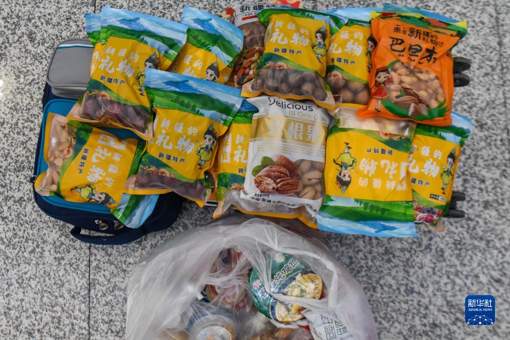 汪元芳一家行囊里裝的物品。除了在火車(chē)上的吃食外,汪元芳的父母還給他們裝了葡萄干、核桃、大棗等新疆特色干果(1月26日攝)。