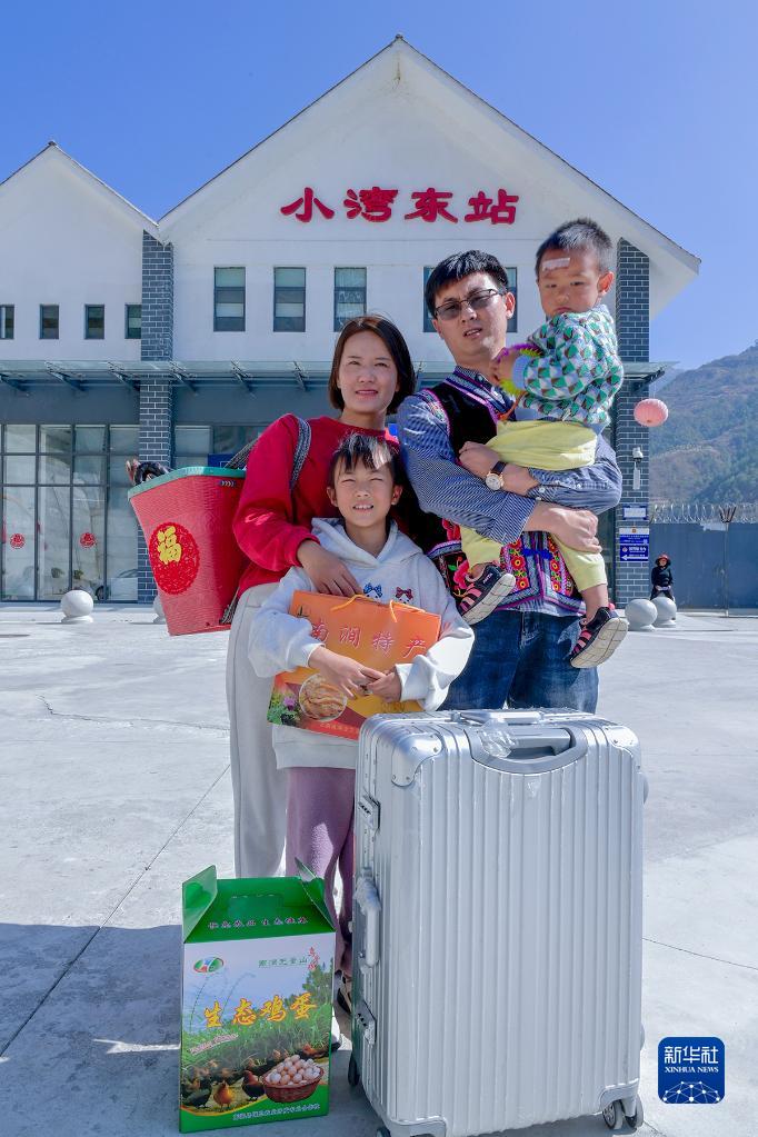 云南省大理白族自治州南澗彝族自治縣小灣東鎮紙房村人蘭云婭(后左一)一家提著(zhù)行李在小灣東站候車(chē),準備返回昆明(1月26日攝)。從前,從小灣東鎮到昆明需要一天一夜,現在乘高鐵只要3個(gè)小時(shí)就能到達。