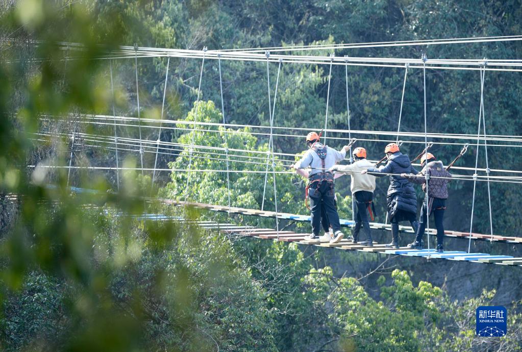 1月27日,游客在湖北省宣恩縣鑼圈巖地質(zhì)公園體驗高空行走。