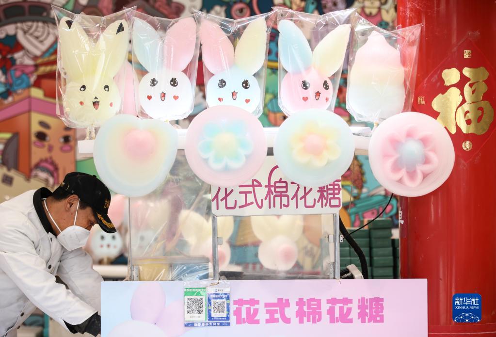 1月27日,在北京南鑼鼓巷,工藝師在制作兔子造型的特色棉花糖。