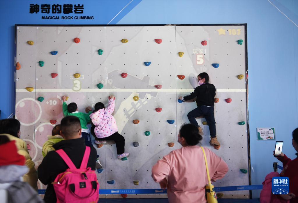 1月27日,小朋友在河南省科技館新館“創(chuàng )享空間”展廳體驗攀巖項目。