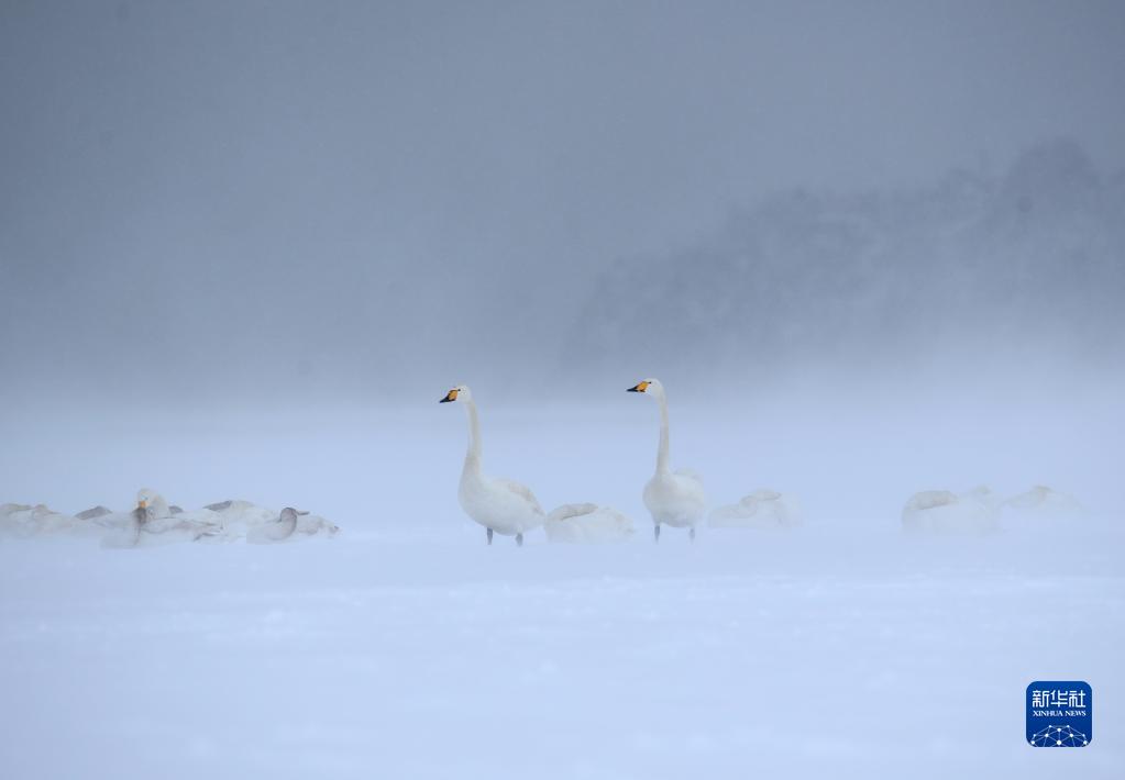 近日,山東榮成出現降雪。在榮成天鵝湖,大天鵝迎風(fēng)戲雪,翩翩起舞。