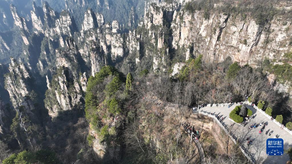 1月27日,游客在張家界國家森林公園游覽(無(wú)人機照片)。