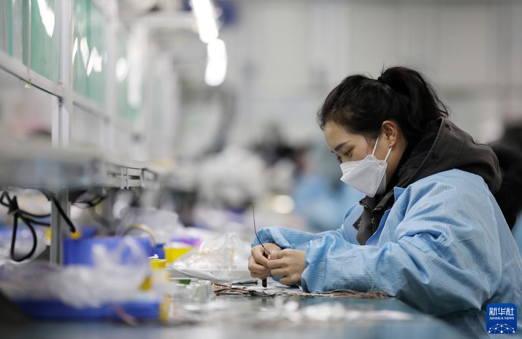 1月28日,山東省臨沂市郯城縣郯城街道一家電子企業(yè)的工人在生產(chǎn)線(xiàn)上工作。