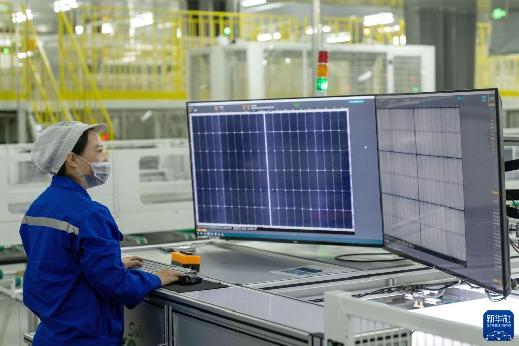 1月28日,工人在安徽省合肥市肥東縣合肥循環(huán)經(jīng)濟示范園內某太陽(yáng)能光伏組件生產(chǎn)公司的車(chē)間作業(yè)。
