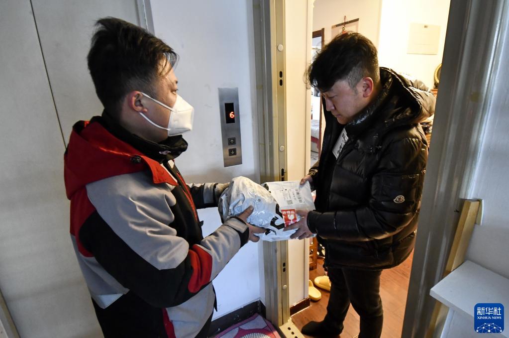 1月28日,順豐速運快遞員蔣雙建在北京市朝陽(yáng)區青年路某社區送兔年開(kāi)工第一個(gè)工作日的第一單快遞。