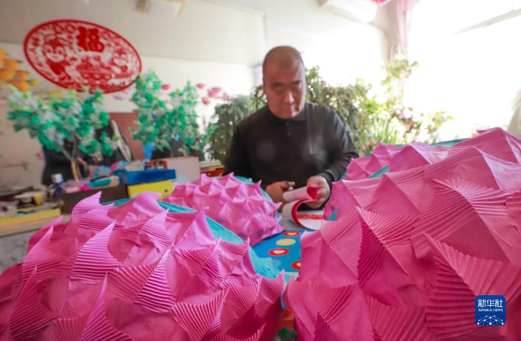 1月28日,遷西縣灑河橋鎮的民間藝人在趕制元宵節演出的跑花燈。