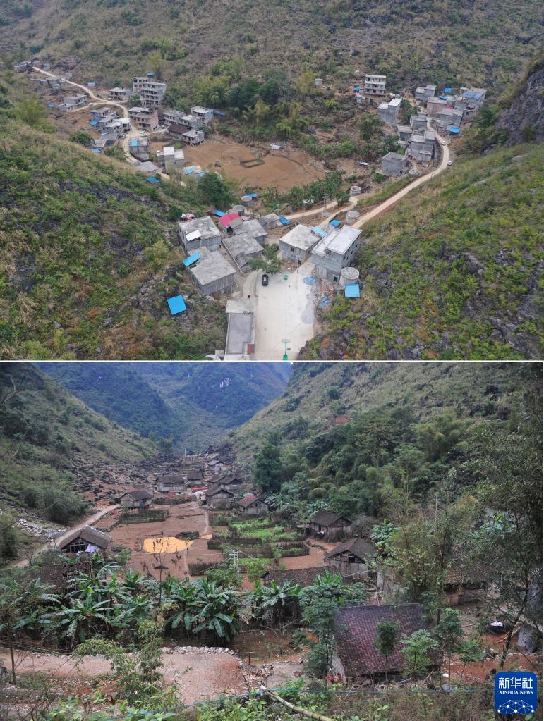 拼版照片:上圖為2023年1月20日拍攝的弄勇村弄朝屯(無(wú)人機照片);下圖為2012年12月27日拍攝的弄勇村弄朝屯。