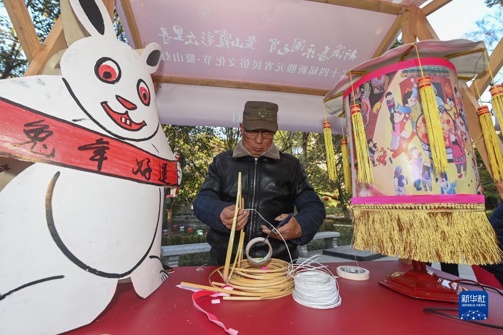 1月29日,在嘉興市秀洲區新塍古鎮小蓬萊公園內,傳統藝人在“鰲山燈會(huì )”現場(chǎng)展示紙扎燈技藝。