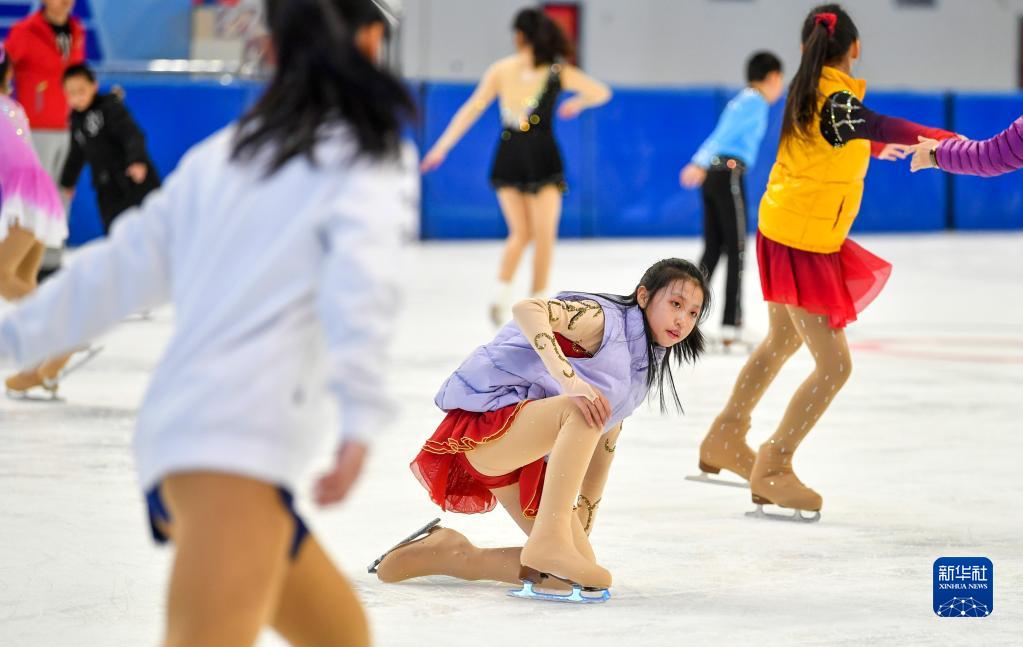11歲的仵昱霏在練習時(shí)不慎摔倒后起身(1月29日攝)。
