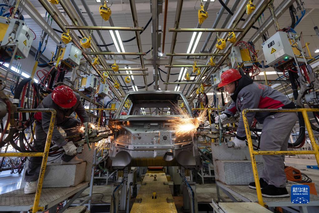 1月30日,工人在貴州省銅仁市萬(wàn)山區一家汽車(chē)制造企業(yè)的焊裝車(chē)間作業(yè)。
