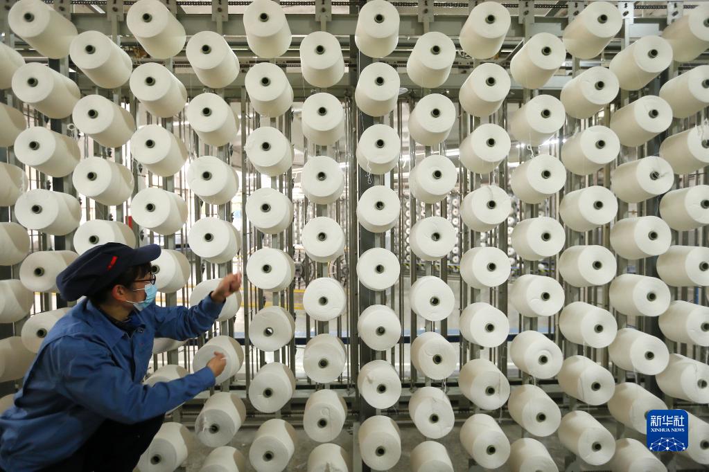 1月30日,在位于山東省青島市即墨區龍山街道的一家紡織企業(yè),紡織工人在生產(chǎn)線(xiàn)上掛棉紗。