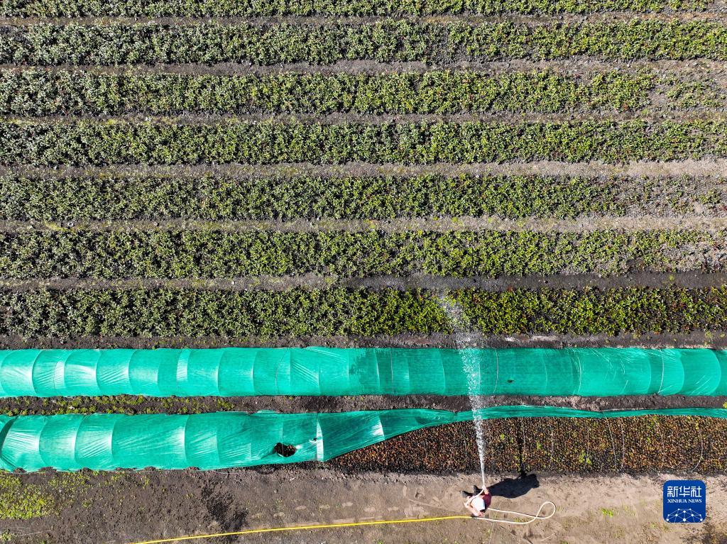 1月30日,在貴州省畢節市朱昌鎮農業(yè)產(chǎn)業(yè)園區,農民為苗圃澆水(無(wú)人機照片)。