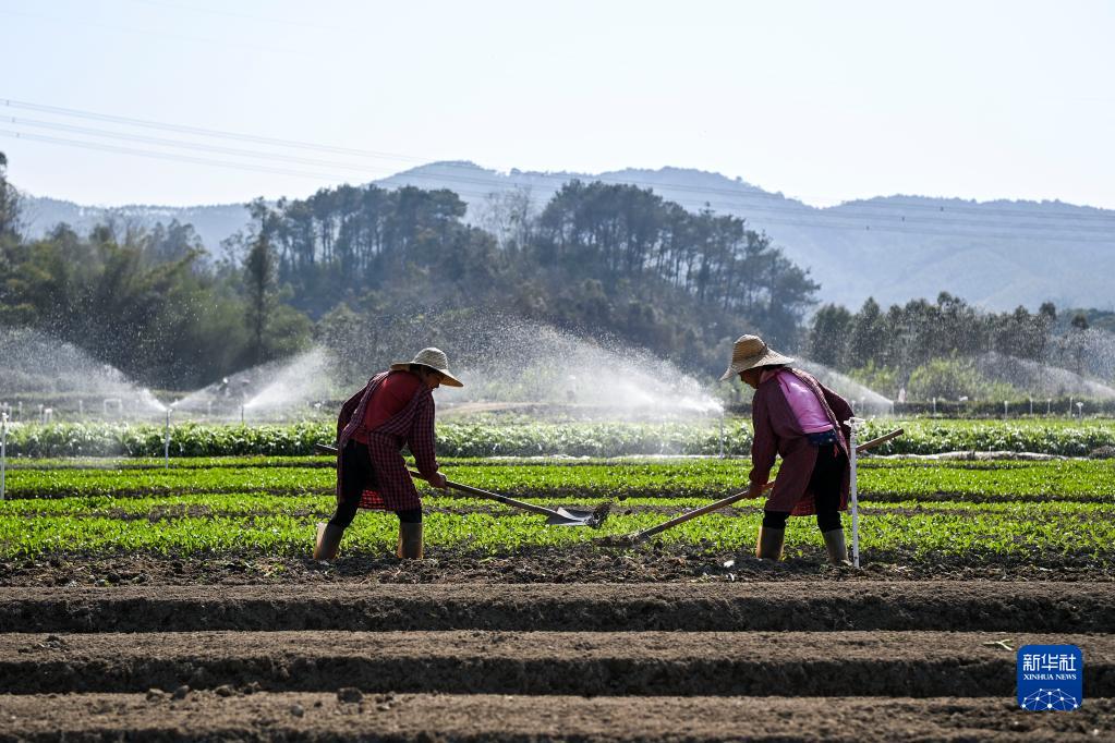 1月30日,廣西興業(yè)縣石南鎮的一處蔬菜種植基地內,當地群眾在平整土地。