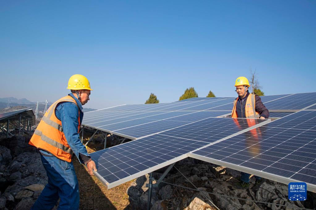 1月30日,在貴州省黔西市一光伏電站項目施工現場(chǎng),建設者在安裝光伏組件。