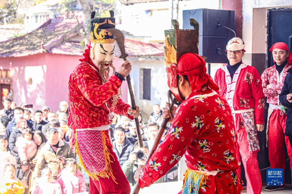 1月29日,在江西省撫州市南豐縣萊溪鄉黃滿(mǎn)村,儺舞藝人在表演儺舞。