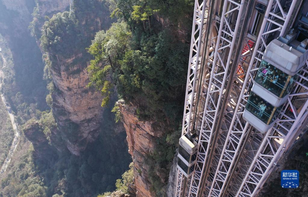 1月30日,游人乘坐張家界百龍天梯游覽(無(wú)人機照片)。