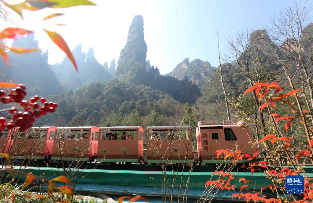 1月30日,游人乘十里畫(huà)廊觀(guān)光電車(chē)在湖南張家界國家森林公園游玩。
