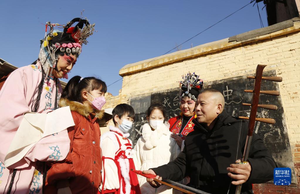 1月30日,在邢臺市襄都區北大街街道辦事處新興東社區,演員給孩子們講解非物質(zhì)文化遺產(chǎn)四股弦知識。