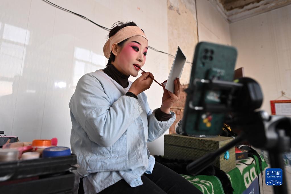 1月30日,在山西省太原市清徐縣孟封村,太原市晉劇藝術(shù)研究院實(shí)驗二團演員在后臺直播化裝。